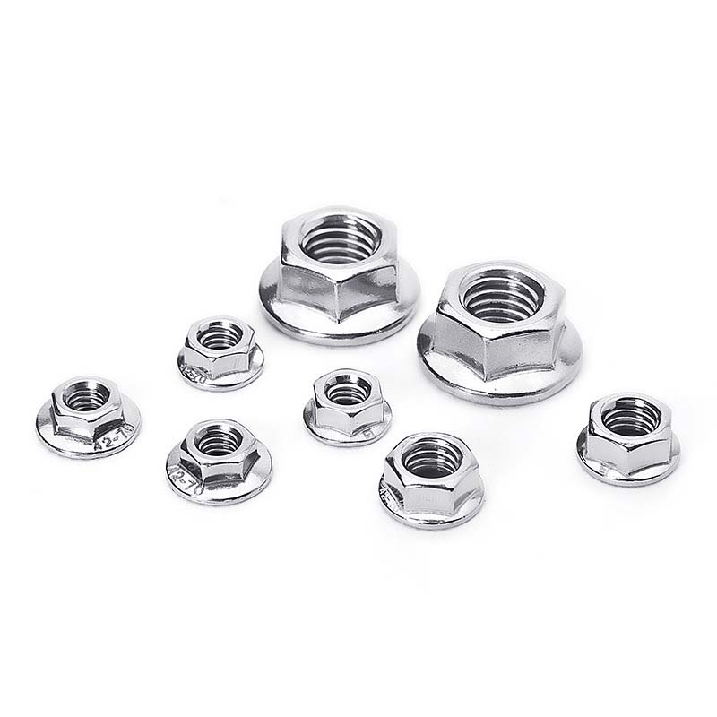 The wide base of the flanged anti loose nut distributes pressure evenly and prevents the surface from being easily stained. The hexagonal shape fits a standard wrench. Materials such as A4 stainless steel can withstand salt water or chemicals. Some models have a serrated edge under the flange to enhance grip.