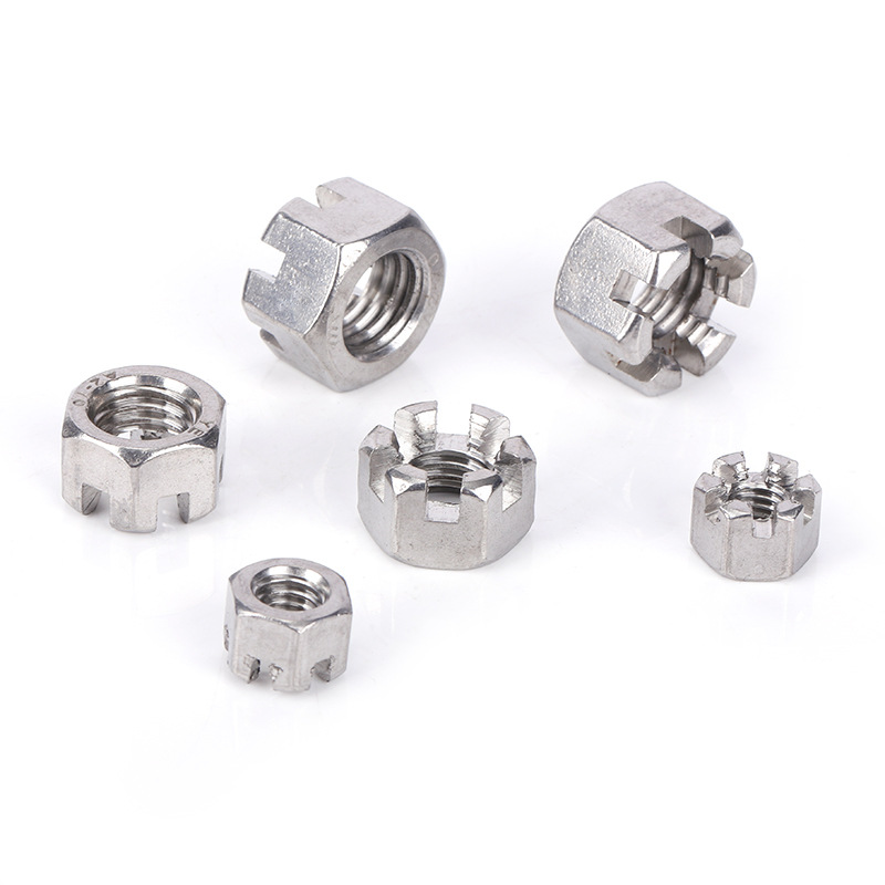 These also come in fractional inch sizes like 1/2"-20 or 5/8"-18. Hex size follows standard SAE wrench sizes, and slot spacing is fixed to match cotter pin diameters, usually 1.5mm to 3mm depending on nut size.