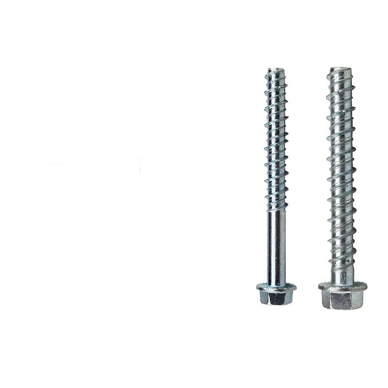 This bolt is basically a simple cylindrical shape. Its most notable feature is that there are threads all along the length of the bolt. These threads are very sharp and evenly spaced, precisely designed to allow the bolt to be directly inserted into the concrete. There are no additional grooves or markings on the bolt body, and it smoothly transitions from the threads to the lower edge of the head.